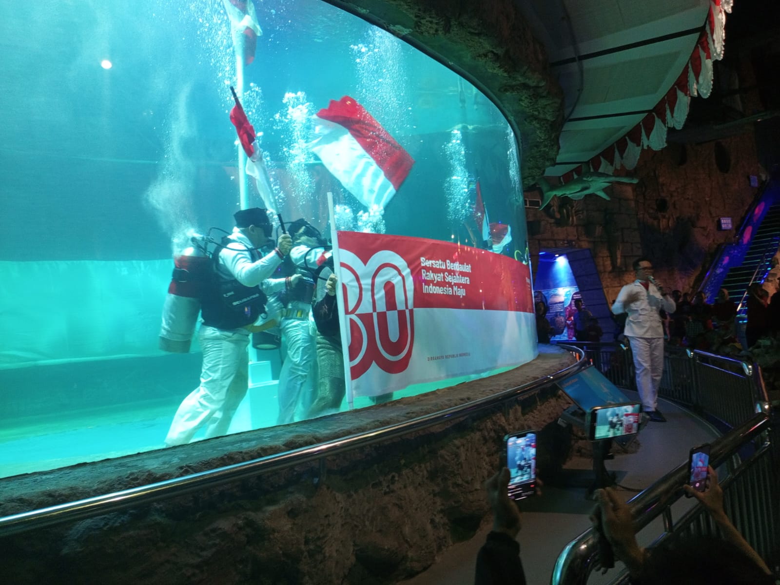 Dengan Menggunakan seragam Paskibraka Ruben Onsu bersama Team HUT RI ke 80 Sea world Ancol tepat pada jam 10.00 WIB acara menaikan bendera mulai dilaksanakan didalam aquarium yang didalamnya ada 18 ekor Hiu berjalan dengan sukses disaksikan para pengunjung Seaworld antusias menatap terus kedalam Aquarium sewaktu Artis Robin Onsu sebagai penyelam yang telah Bersertifikat sedang melaksanakan Proses menaikan Bendera
