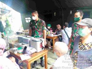 Kodim 0503/JB Koramil 01/TS – Hari kedua Tenaga Kesehatan (Nakes) Kesdam Jaya berkolaborasi dengan Puskesmas Tamansari melayani masyarakat yang ingin vaksin di serbuan vaksinasi