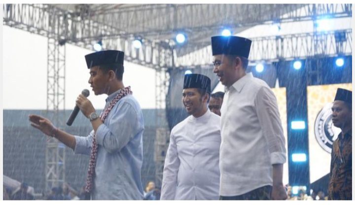 Gibran pun yang merasa tersentuh dengan antusiasme para emak-emak langsung keluar dari panggung, menerobos hujan yang sedang turun dan menghampiri massa pendukung yang memang didominasi oleh kaum ibu-ibu.