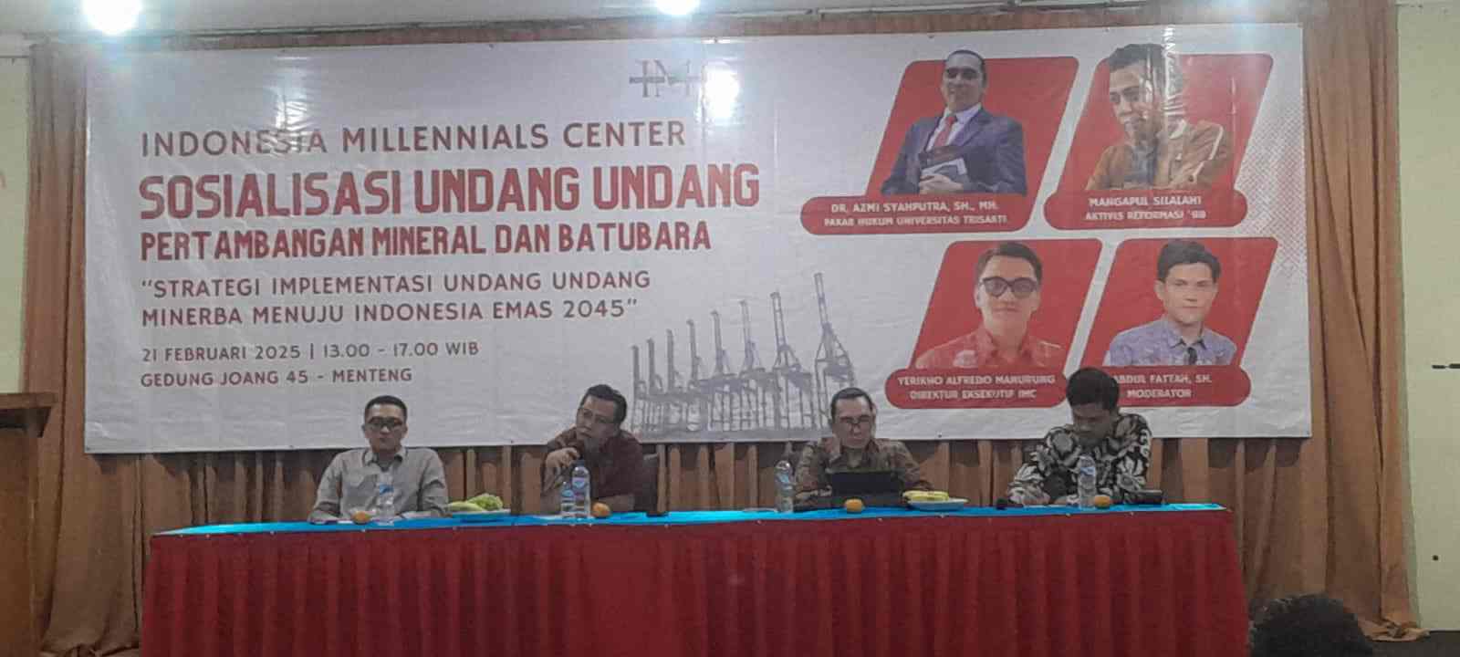 Indonesia Millennials Center (IMC) menggelar sosialisasi Undang-Undang Pertambangan Mineral dan Batubara (UU Minerba) yang baru disahkan, dengan tema Strategi Implementasi Undang-Undang Minerba Menuju Indonesia Emas 2045.