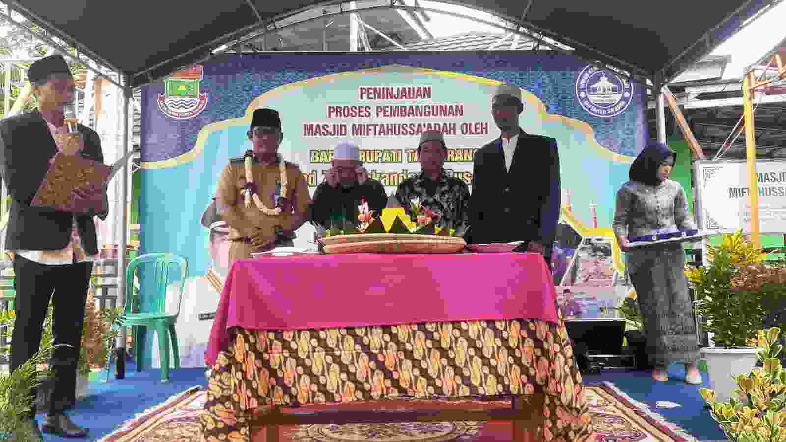 Pelaksanaan Dalam rangka peninjaun Bupati Zaki Iskandar Kabupaten Tangerang atau yang mewakili dalam proses pembangunan Masjid Miftahus sa’adah yang barengi oleh pemotongan tumpeng dilokasi giat Perum Sepatan Residen Jalan Raya Paku Haji Desa Kayu Bengkok Kecamatan Sepatan Kabupaten Tangerang.